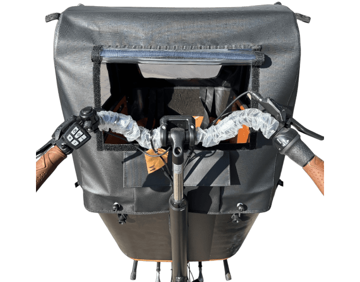De regentent is speciaal ontwikkeld voor de Vogue Carry 2 elektrische bakfiets en sluit perfect aan op het frame. Dankzij de sterke waterdichte ritsen (10mm) en transparante ramen behoud je goed zicht op de weg én op je passagiers.